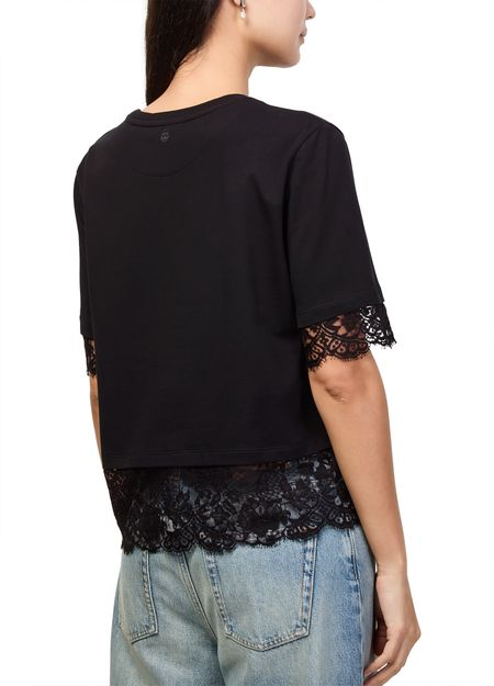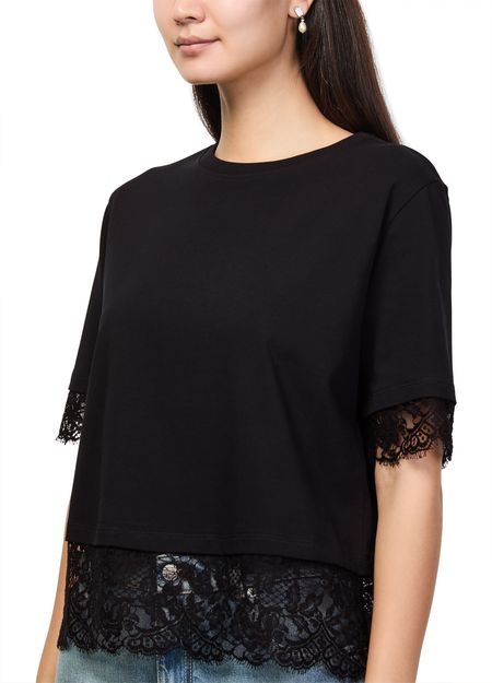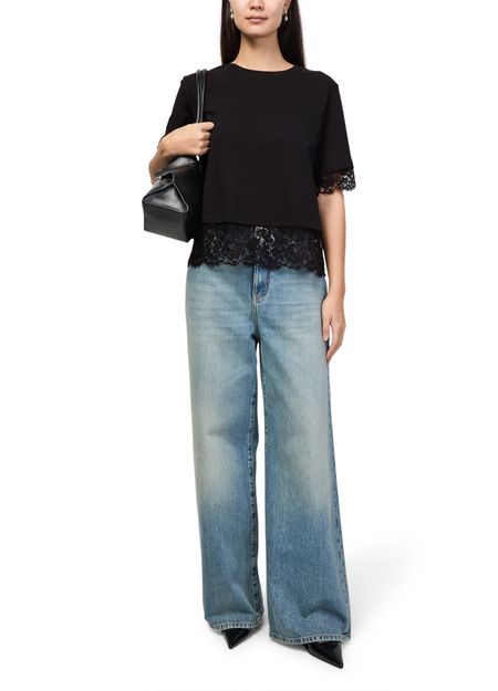Reveal Alexander McQueen's short-sleeved t-shirt with lace, featuring a refined crew neck and delicate floral embroidery. The soft silhouette and intricate detailing make this top a standout piece, perfect for elevating both casual and sophisticated ensembles with effortless flair.