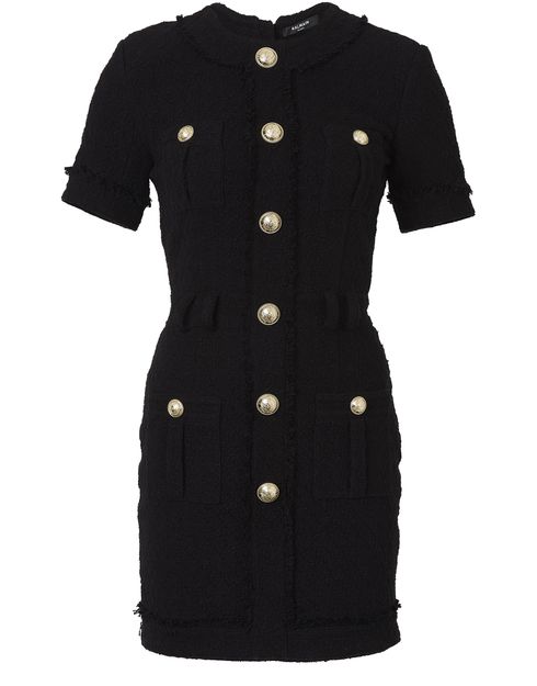 This short black tweed dress is designed by Balmain. Decorated with large gold buttons, wear with a pair of white patent ankle boots for a confidently preppy look.