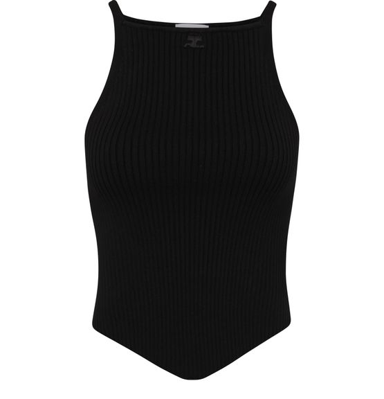 Courrèges's Signature pointy rib knit top is a stylish crop design that effortlessly combines comfort and chic. With delicate shoulder straps and a flattering rectangular neckline, it hugs your figure beautifully. The subtle logo at the back label adds a touch of sophistication, making it a must-have for any wardrobe.