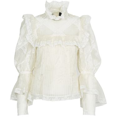 With this silk blouse, Marc Jacobs Runway has created a characterful piece that blends fluidity, a ruffled neck, puff sleeves and contrast fabrics.