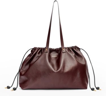 Indulge Isabel Marant's Silven tote bag, crafted in elegant smooth leather. This tote features double handles and a drawstring closure for functional elegance. The zippered interior pocket and visible topstitching highlight craftsmanship, while the front logo in gold letters and metal finish embody signature style.