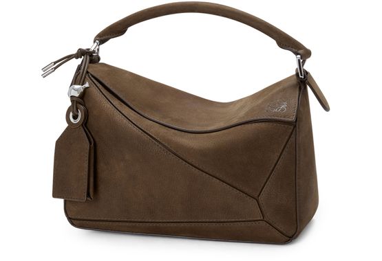 Reveal Loewe's small Featherlight Puzzle bag in grained nubuck, a statement piece defined by its sculptural silhouette and visible stitching. The adjustable, detachable thin strap and single handle offer versatile carrying options, while the engraved logo and silver finish add a refined touch. A discreet back pocket ensures practical elegance.