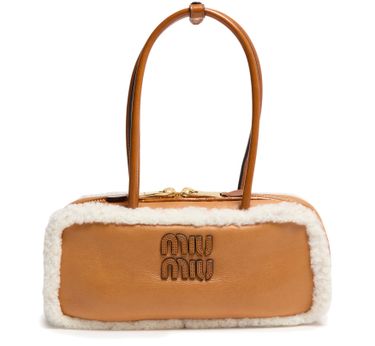 Discover Miu Miu's Beau small shearling bag, a masterpiece of elegance. Crafted from smooth leather with a metallic 'Miu Miu' lettering, this shoulder bag features double handles and a zipper closure. The detachable interior purse and visible topstitching complement its gold finish, making it a perfect addition to your modern ensemble.