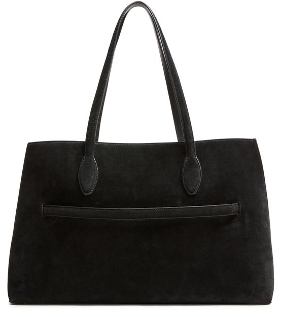 Reveal Toteme's suede lounge tote bag, a masterpiece of modern design. Crafted from premium suede, it features a spacious interior with a large compartment and open pocket. The double handles and visible topstitching add to its elegance, while the embossed front logo and silver finish complete the sophisticated look.
