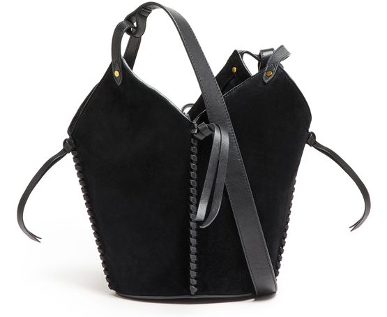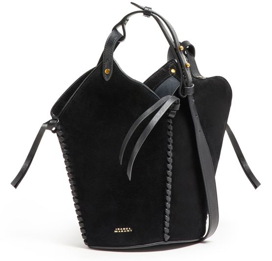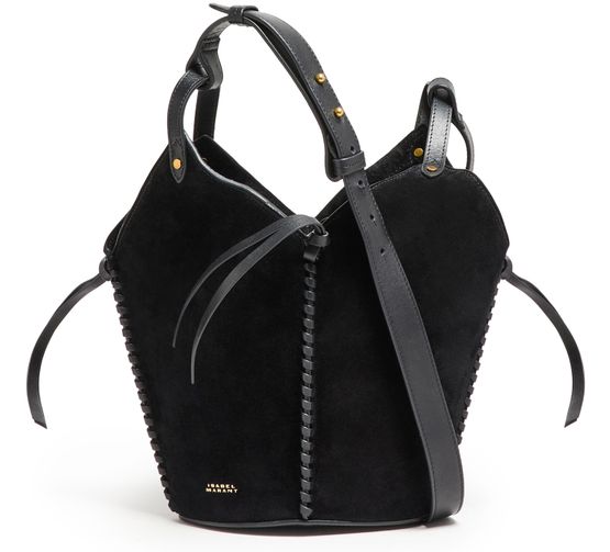 Reveal Isabel Marant's Tampa mini bag, a sophisticated piece featuring visible topstitching and a gold-printed logo. This bucket bag is elegantly carried on the shoulder with a thin, adjustable strap. Its single compartment includes interior patch pocket for practicality.