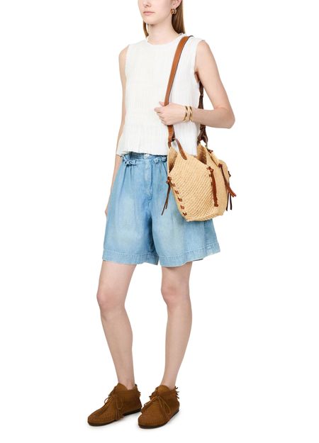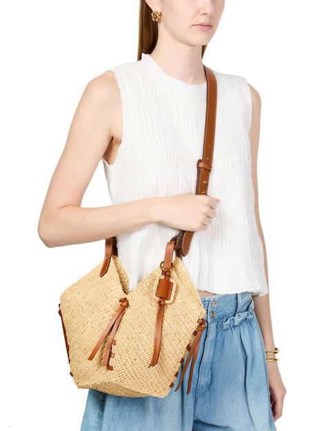 Isabel Marant's Tampa raffia shoulder bag is a versatile accessory, hand carried or worn on the shoulder. With an adjustable thin strap and contrast stitching, it showcases an appliquéd logo on the front. This chic shopper tote features a single compartment and a stylish braided leather finishes, perfect for any occasion.