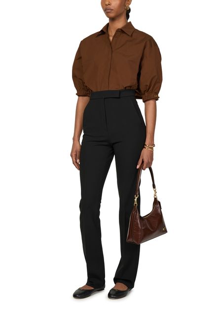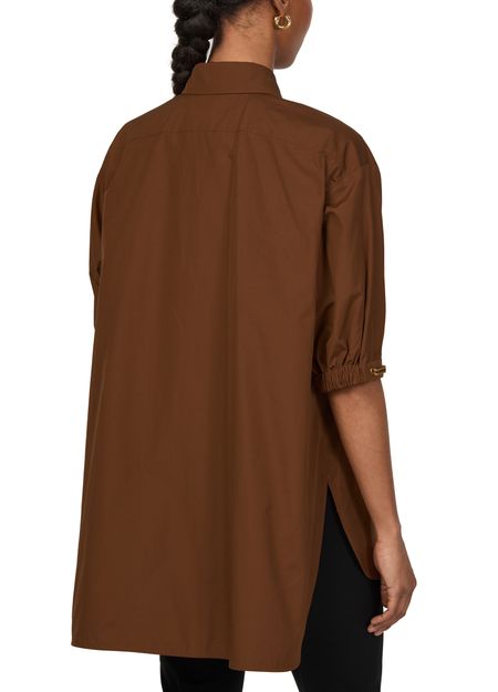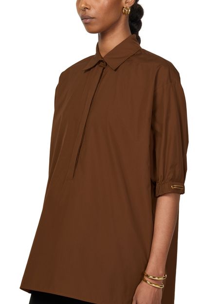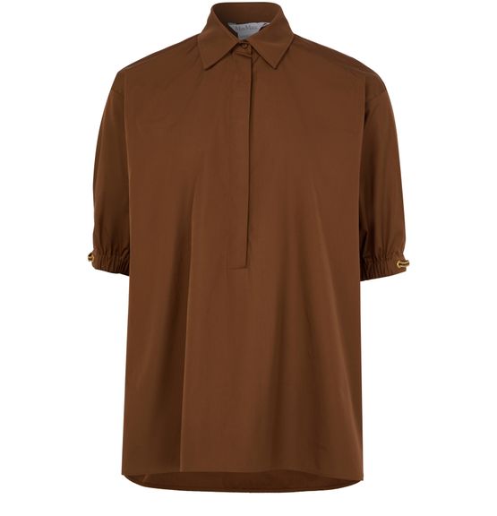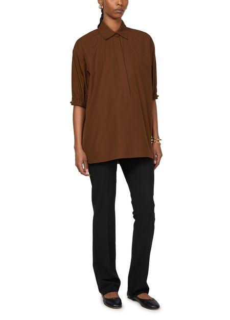 Max Mara's Teano cotton poplin blouse showcases a front buttoned closure and a chic shirt collar. With three-quarter sleeves and puff details, it offers a stylish silhouette. Visible stitching and pleats on the front add elegance, while the shorter front and regular length create a flattering shape for any occasion.