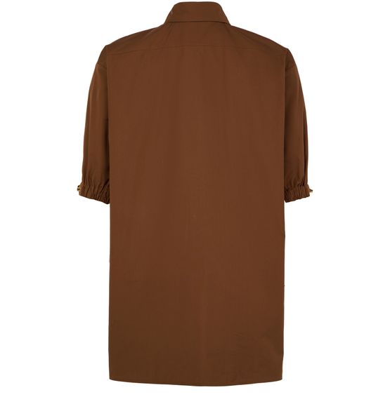 • Description : front buttoned closure, visible stitching, appliquéd logo, shorter at the front, three-quarter-sleeved, puff, regular length, shirt collar, pleats on the front, shirts.
