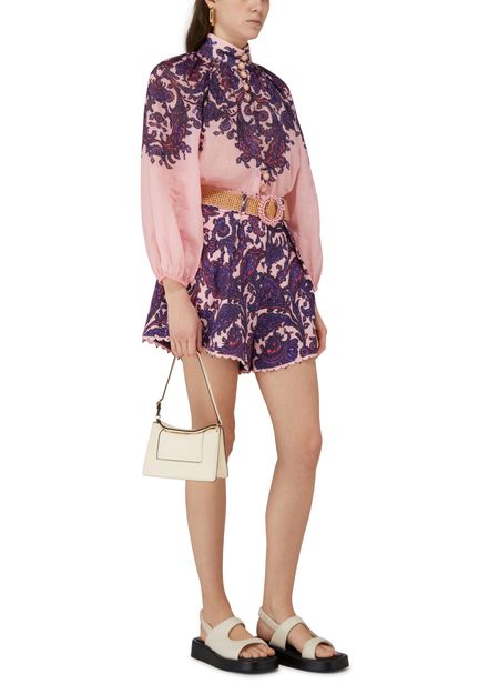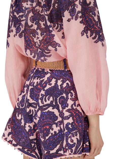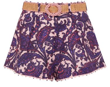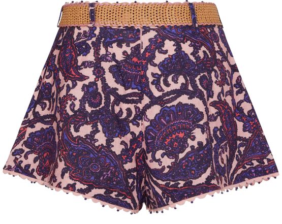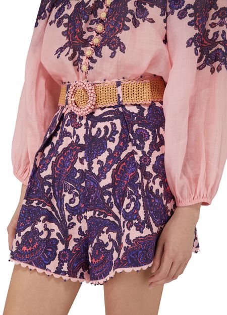 Description : Mid-length shorts, a-line cut, belted waist, paisley pattern, multicolored print, scalloped edge, bead details / Pearl details (en fonction du type de perle), high-waisted fit.