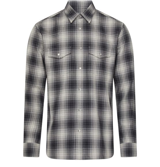 Tom Ford Distribution's Western shirt showcases a stylish checked pattern with long-sleeved elegance. Its front buttoned closure and button fastening enhance functionality, while cuffed sleeves and buttoned cuffs add a refined touch. Two flap pockets provide practicality, and the logo at the back label signifies a commitment to quality in casual shirts.