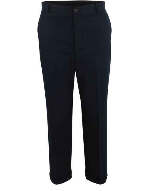 The classic cut of Thom Browne's 1" Cuff Cavalry Twill chinos contrasts with the brand's signature details on the hem and belt. Their go-anywhere colour will make them a wardrobe staple. Wear Thom Browne's piece with a slim fit cotton shirt and leather brogues.
