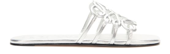 Reveal Loewe's Anagram Petal laminate lamb leather sandals, crafted with a sleek open round toe and a low heel for modern comfort. The silver finish and graphic cut-outs add a refined edge, while the front logo delivers a signature touch to these standout sandals.