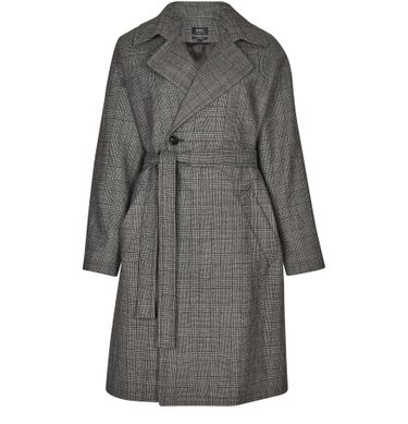 • Description : Three-quarter length coat with collar, buttoned fastening, tie belt, side pockets, prince of Wales check pattern, loose, flowing cut, timeless piece.