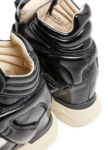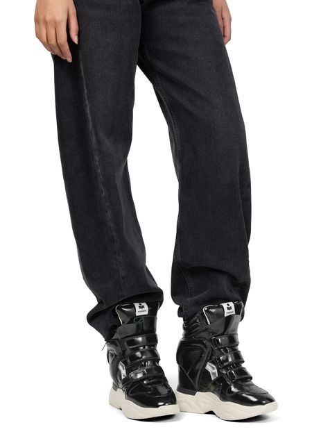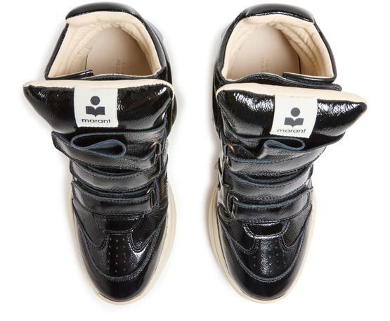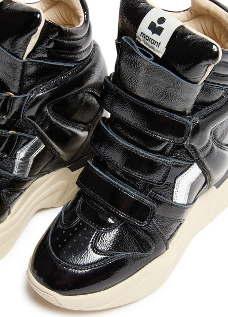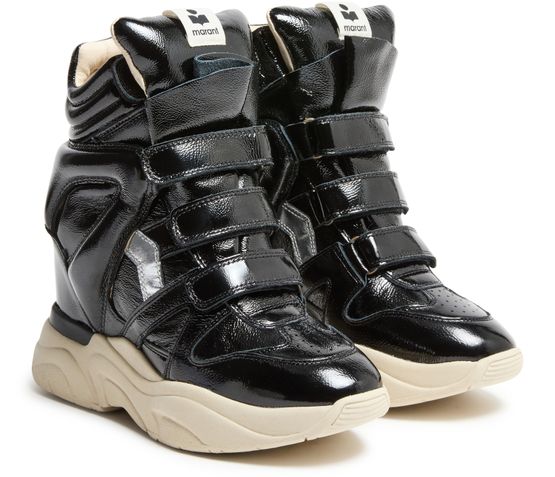 Unveil Isabel Marant's Balskee sneakers, crafted from patent leather with a medium wedge heel. These sneakers feature a round closed toe and a thick outer sole, ensuring both style and comfort. The high-top upper is complemented by visible stitching and Velcro fastening, while logos on the tongue and back add a touch of sophistication.