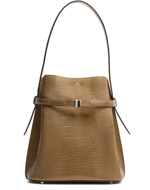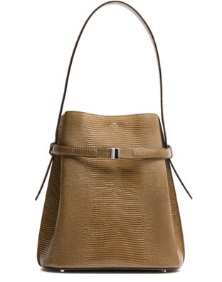 Unveil Toteme's belted lizard embossed bucket bag, a masterpiece of modern design. This shoulder bag features a striking snakeskin pattern and a sleek silver clasp, perfectly complemented by its single handle and visible topstitching. Experience the epitome of style with this sophisticated accessory.