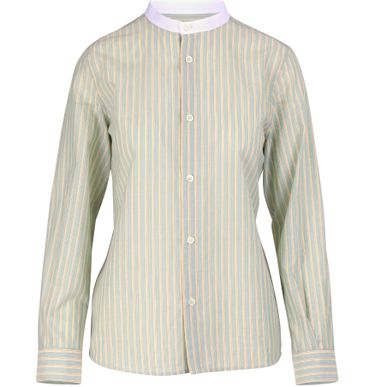 You'll love the delicately elegant styling of the Bettina blouse. This A.P.C. exclusive has a white mandarin collar which you can wear open or closed, and blue and white stripes on an asymmetric cut which is shorter in front than at the back. With long buttoned sleeves, this blouse will be perfect with a skirt or trousers.