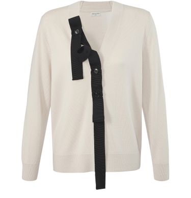 By Dries Van Noten, this cardigan is embellished with a stylish black ribbon along the placket. Wear buttoned up, next to the skin, with a pencil skirt, for a look that is stylish and seductive.