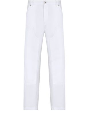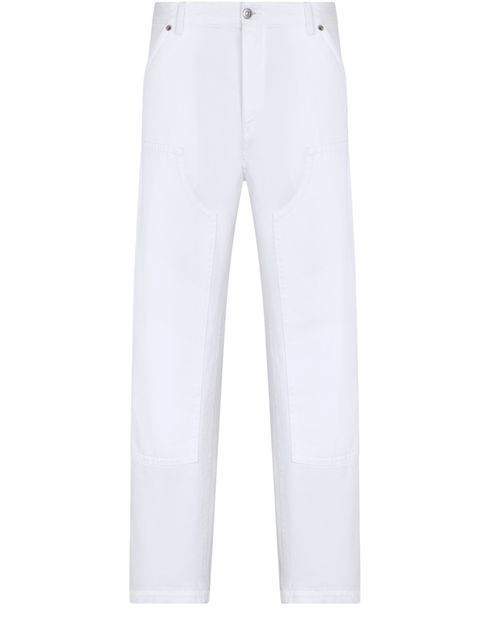 Introducing Dior's Carpenter Jeans in cotton. These jeans showcase a Dior-embossed leather tag on the back, adding a touch of elegance. With belt loops and a five-pocket style, they offer practicality and vintage appeal. Made from medium-weight 12.5 oz denim, these jeans are laser-faded for a classic look, crafted in Italy.