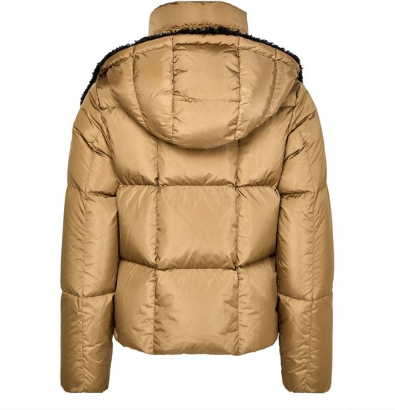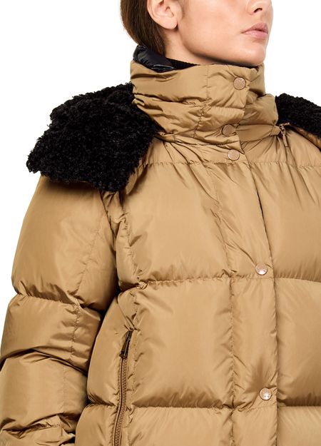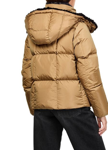 • Description : Short, hood, long-sleeved, side pockets, buttoned zipper closure, padded texture, fur detail.