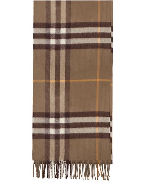 Introducing Burberry's checked cashmere scarf, a stylish blend of timeless elegance and modern flair. Crafted with the iconic Burberry Check, this piece boasts fringed edges and a printed logo for added sophistication. Perfect for elevating any ensemble with its distinctive design.