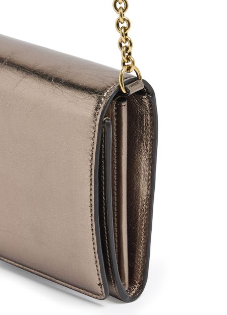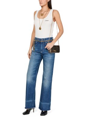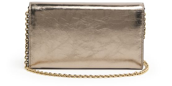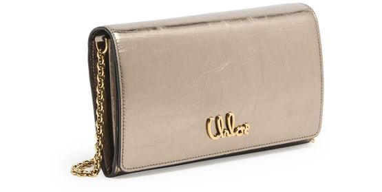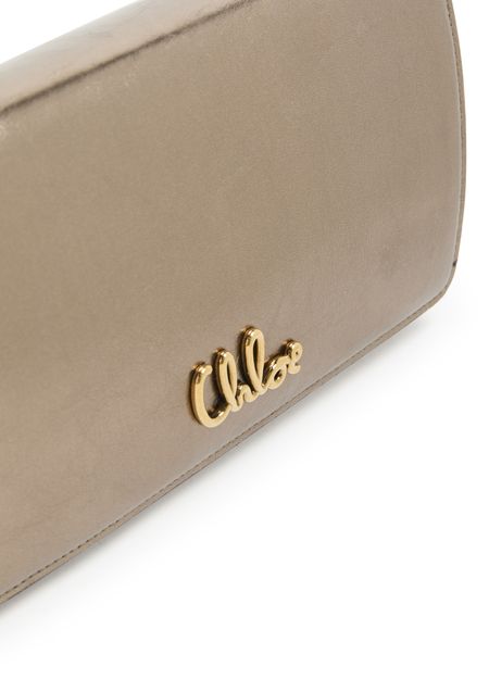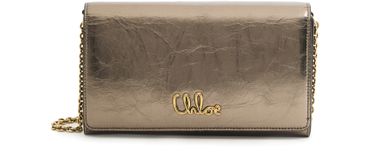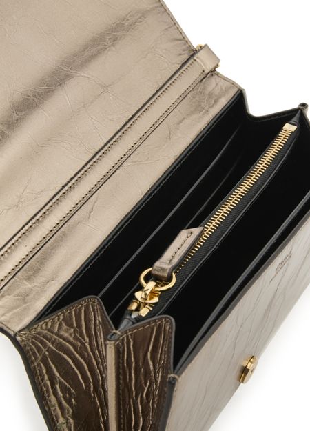 Chloé's Iconic bag captivates with its magnetic closure and flap design, showcasing a front logo in gold letters. The single handle and chain strap allow for versatile styling, whether worn crossbody or by hand. A zippered interior pocket and visible topstitching add practicality, while the gold finish elevates its elegance.