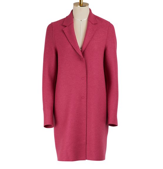 Harris Wharf features refined lines on this cocoon wool coat. The London-based brand is well-known for its coats and blazers in impeccable cuts and bright colors. This piece is offered in multiple deep colors and displays a notched lapel collar and three invisible buttons. Wear this model over a funnel neck sweater and neutral slim-fit pants to let its contrasting color shine through.