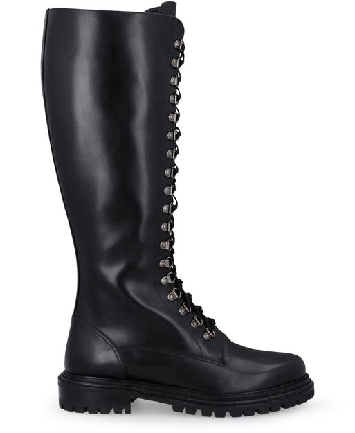 The Combat-boots are designed by Aquazzura. These high-top shoes feature a rounded design. They are characterized by their thick notched sole and high lacing that rises to just beneath the knee.