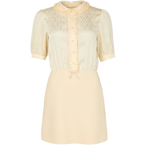 Valentino's Crepe couture mini dress showcases a playful printed design with a polo-shirt collar and short sleeves. Its fitted waist accentuates the silhouette, while the A-line cut adds a touch of elegance. A concealed back zipper closure and visible stitching complete this chic piece, perfect for any stylish occasion.