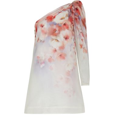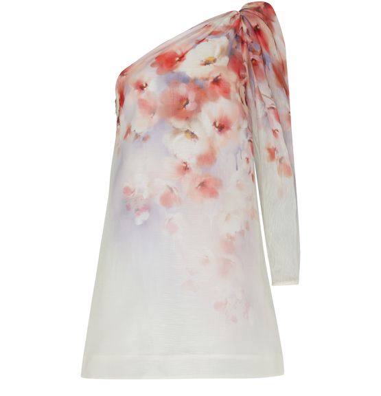Zimmermann's Crush asymmetrical mini dress captivates with its long-sleeved design and daring bare shoulder. The asymmetric neckline beautifully frames the face, while gigot sleeves add a touch of drama. With a flowing A-line cut and delicate floral print, this dress effortlessly blends elegance and playful charm for any occasion.