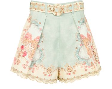 Reveal Zimmermann's Daylight shorts with darts, featuring a vibrant floral print and delicate scalloped edges. The button fastening and detachable belt offer both style and versatility, while embroidered details add a refined touch—perfect for elevating your warm-weather wardrobe with effortless sophistication.