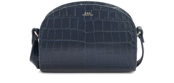A.P.C.'s small Demi-Lune bag is in crocodile effect leather. The designer's logo is in gold letters on the front.