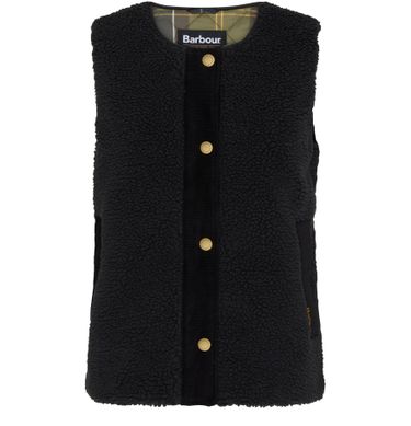Barbour's Dulsie liner gillet showcases a sleeveless, collarless design perfect for layering. With a front buttoned closure and embellished buttons featuring a gold finish, it adds a touch of elegance. The appliquéd logo at the back and side welt pockets enhance its casual charm, making it a versatile addition to any wardrobe.