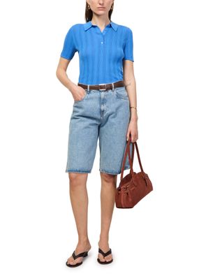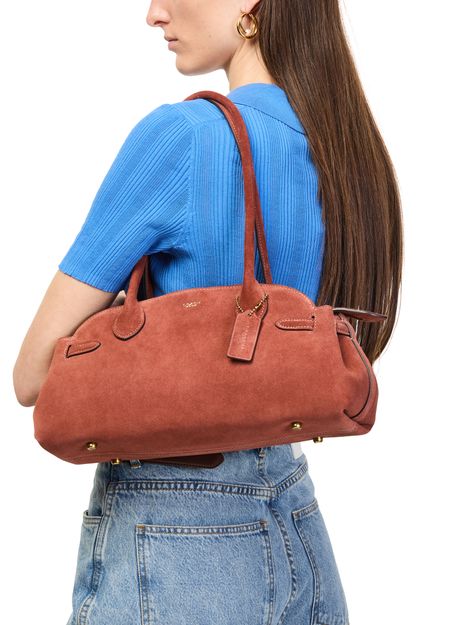 • Description : Shoulder bag, double handles, leather handle, thin strap, front logo, logo in gold letters, suede, zipper closure, zippered interior pocket, tone-on-tone lining.