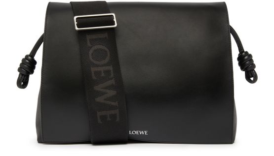 Loewe's Flamenco satchel bag is designed with a single compartment and flap closure. The logo in silver letters adds a touch of sophistication to the front logo. The silver finish gives it a sleek look. It includes a zippered interior pocket for organization. The wide strap can be worn on the shoulder or crossbody.