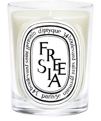A garden in bloom in springtime. The refill holds a bouquet of multicolored freesias, releasing their delicate, fragrant brightness.