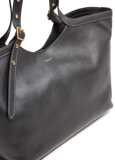 Reveal Coach's Gramercy natural grain leather tote bag, a masterpiece of smooth leather craftsmanship. Featuring a decorative label with an embossed "Coach" logo, this tote offers a large interior compartment and open interior pocket. The snap-button fastening and contrast stitching add a touch of elegance.