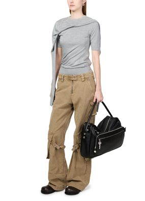 • Description : zipper closure, visible topstitching, silver finish, worn crossbody, hand carried, detachable strap, zippered front pocket, wide strap, double handles.