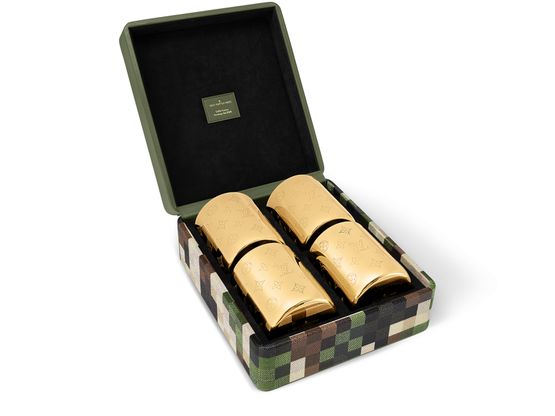 The set of four golden Jack Glasses is presented in an elegant box covered in Damoflage coated canvas, the featured pattern at Pharrell Williams’s debut show for Louis Vuitton. Each glass is expertly crafted and decorated with the Maison’s iconic Monogram motifs, making every sip a delightful experience. The set’s luxurious design will enhance any dining room.