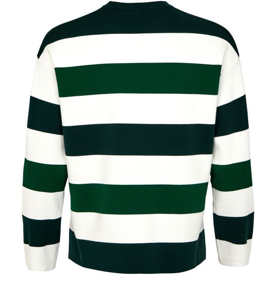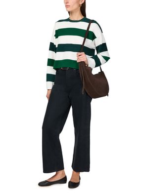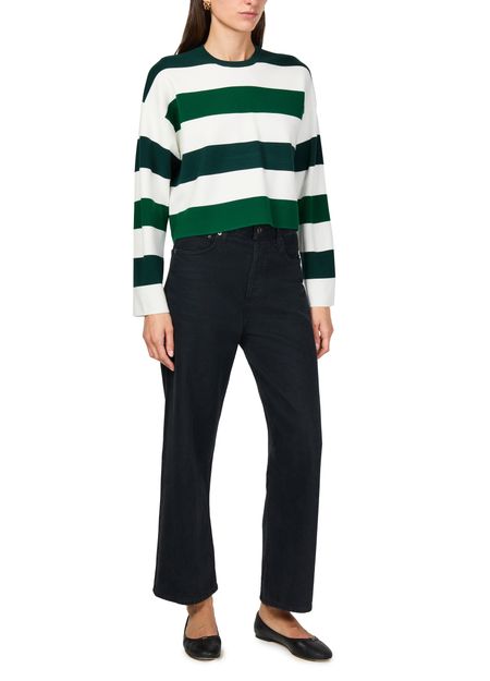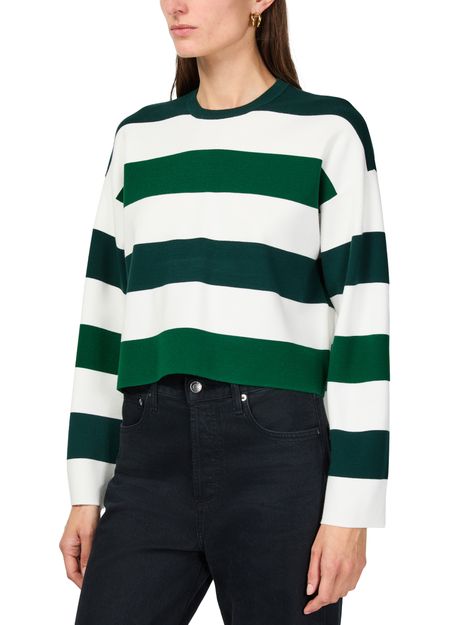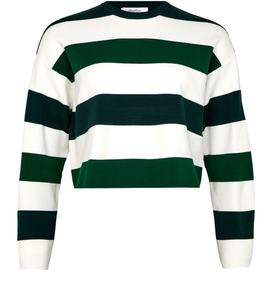 Reveal the Max Mara Jesone round neck sweater, a staple in modern knitwear. With its crew neck and long sleeves, this piece offers a relaxed silhouette with a loose fit. The striped print enhances its trendy crop length, allowing versatile styling for any occasion.