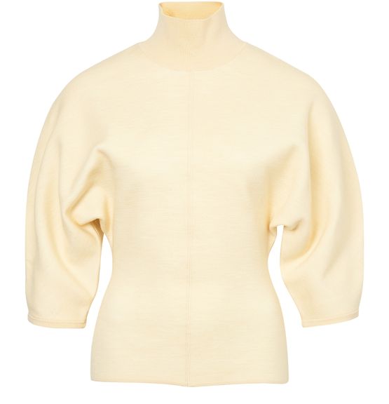The short puffed sleeves and stand-up collar of the Kesther jumper by Acne Studios gracefully dress the feminine shape in a very contemporary style.