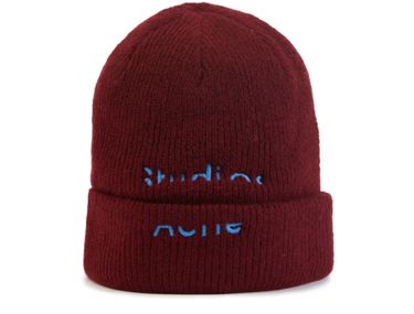 The Kreed hat is a design by Acne Studios. It's ribbed and has a large turn-up embellished with the name of the brand on the front.