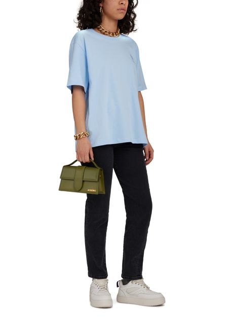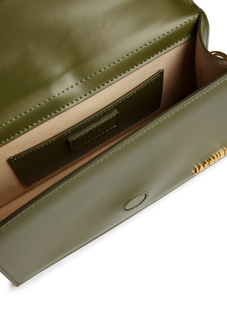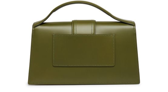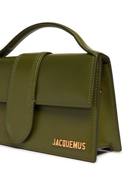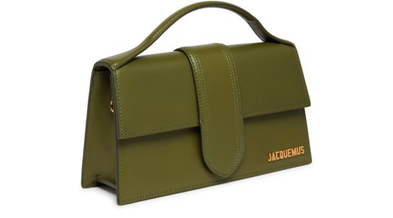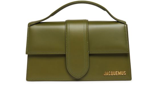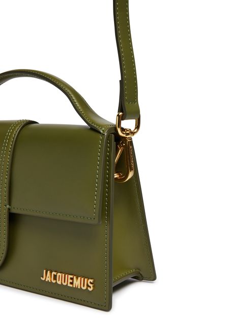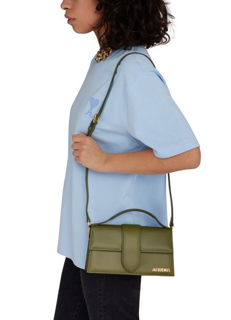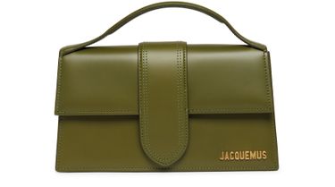 The Jacquemus large Bambino bag is a versatile accessory that can be hand carried, worn on the shoulder or crossbody thanks to its detachable strap. It features a flap closure and a metallic logo on the front, adding a touch of elegance to its design. The handle provides an additional carrying option for the user.