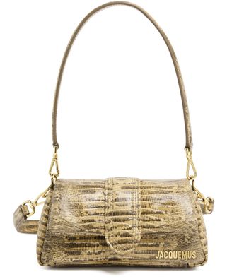 Jacquemus's Le Petit Bambimou bag showcases a chic flap closure and a striking front logo in gold letters. Its double handles and detachable strap allow for versatile styling, whether worn on the shoulder or carried by hand. The visible topstitching and gold finish add a touch of luxury to any outfit.