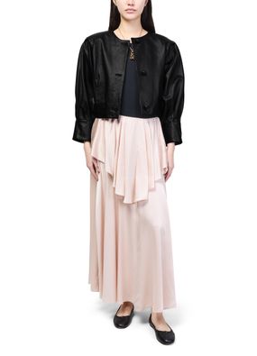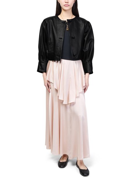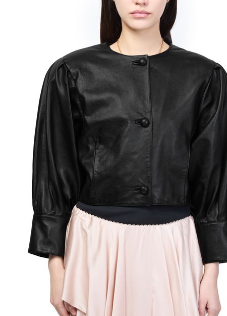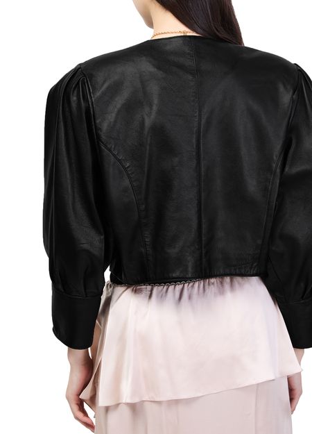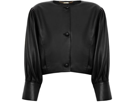 Reveal Chloe's biker jacket, crafted from smooth leather for a refined touch. The cropped silhouette and three-quarter sleeves offer a modern edge, while topstitched edges and a 3-button closure add distinctive detail. Perfect for elevating both casual and sophisticated looks with effortless versatility.