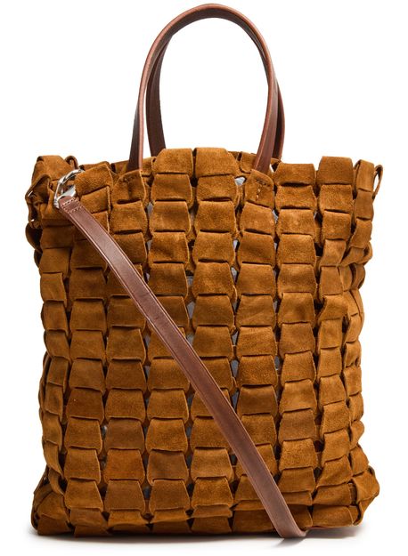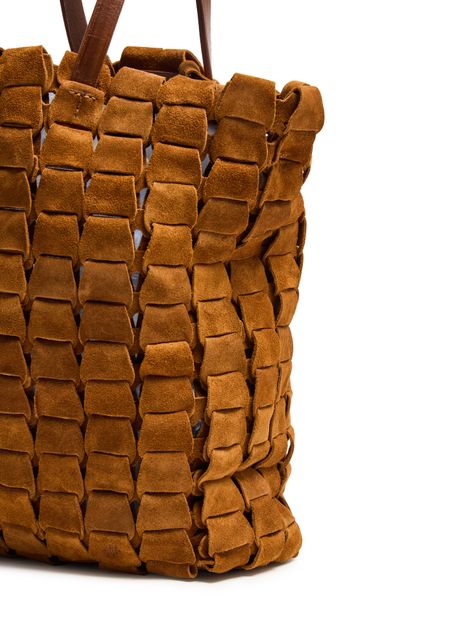 Reveal Dragon Diffusion's Link tote bag, crafted from exquisite suede. This tote features double handles and an adjustable thin strap, offering versatile carrying options. The visible topstitching and padded texture add a touch of sophistication, while the leather interior ensures durability and elegance.