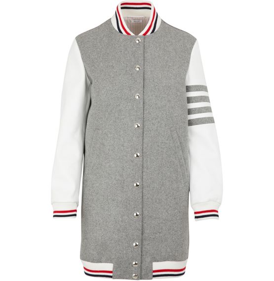 Thom Browne's long wool blazer brings a touch of vintage to your wardrobe. Inspired by varsity jackets, this wool jacket will keep you warm as the seasons change.