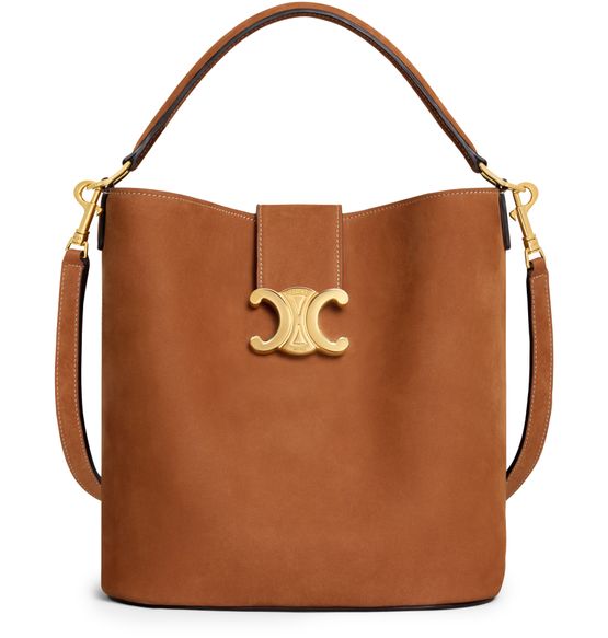 Unveil Celine's Medium bucket Louise in nubuck calfskin, showcasing its gold finishing, versatile hand, shoulder, and cross-body carry options. The leather flap features a Triomphe magnetic closure, complemented by an inner removable zipped pouch, a leather handle, and an adjustable strap for adaptable elegance.
