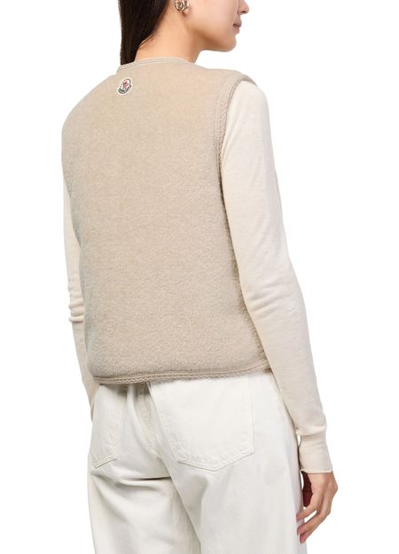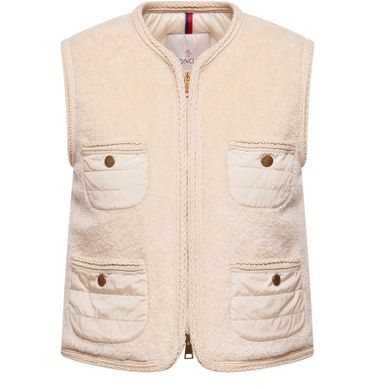 Reveal Moncler's sleeveless bi-material jacket, a modern piece defined by its collarless silhouette and sleek zipper closure. Warm fabric and patch pockets add both comfort and function, while the patch detail elevates its casual appeal. Perfect for versatile styling, this jacket transitions effortlessly from day to night.