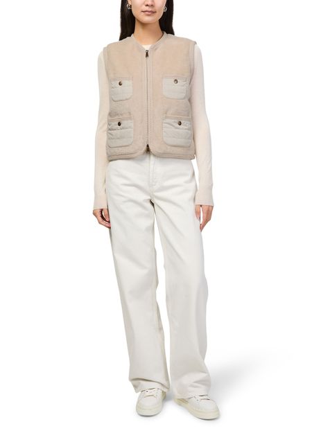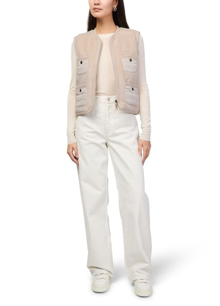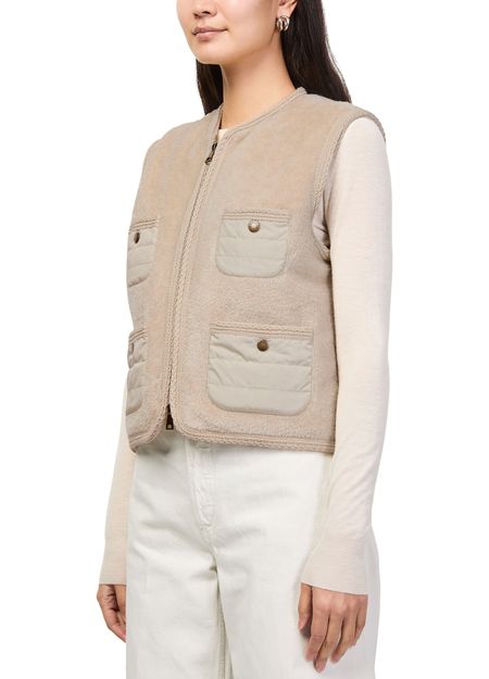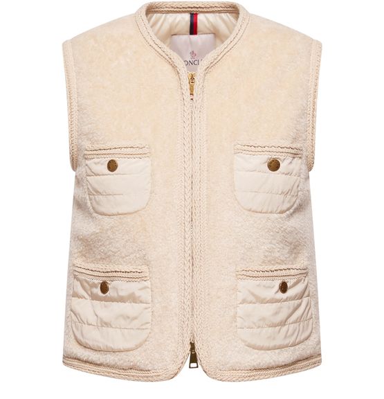 • Description : Bi-material, warm fabric, collarless, sleeveless, patch pockets, zipper closure, patch detail.