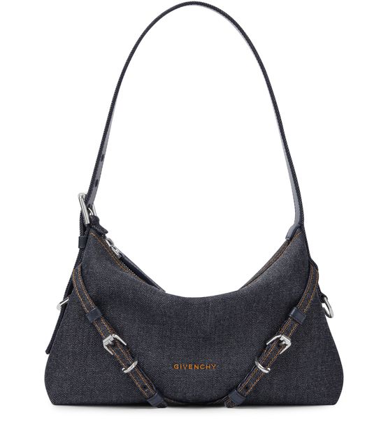 Reveal Givenchy's Voyou mini denim bag, crafted from faded denim with a single handle. This piece features visible stitching and a front logo, offering a modern touch. The zipper closure and single compartment ensure practicality, while the silver finish adds a sleek edge.